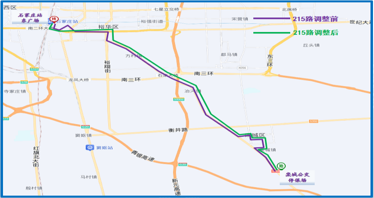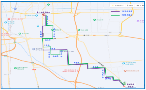 3.调后路径:石栾大街、圣雪路、太行大街、张举路、环城西路、栾武路、宏泰路、衡井路、方西线、南车路、生态街、机械路、和谐街、人大路、裕翔街、南三环、建华大街、方郄路、体育大街、南二环、建华大街、仓丰路。