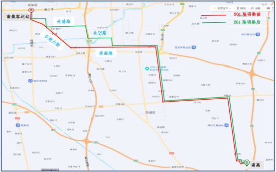 另因,008县道(河庄至南三环)目前断交施工,201路由衡井线临时绕行太行大街、段高路后复原线运行,008县道临时撤销河庄、南客、东客南口、东客、长安机电学校、宋北路口、段干、段干西口、信家庄站位。太行大街临时增设北十里铺、南客、南留、河北警院、宋北太行路口、白求恩医学院站位。