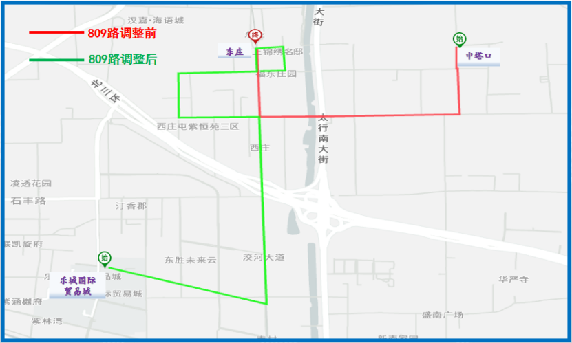 1.起止点:始发站由中塔口调整为乐城国际贸易城,终点站东庄地铁站不变。