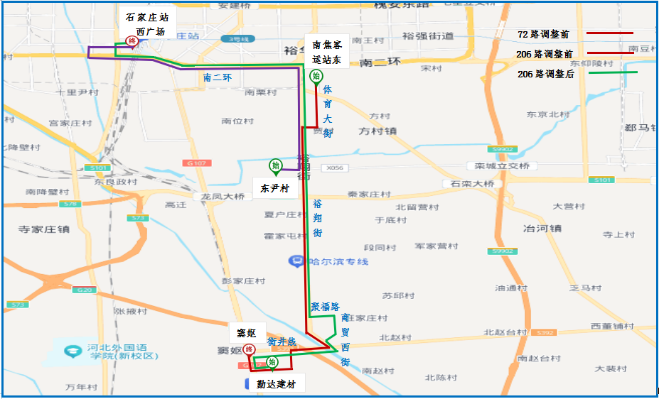 3.调后路径:灵达路、107国道、衡井路、裕翔街、富顺路、商贸西街、聚福路、裕翔街、南二环、中华大街、新石南路至石家庄站返回。